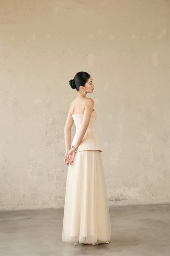上半身は程よくフィットし、裾に向かって広がるシルエットが上品で華やかな印象を与えます。シンプルでありながら存在感があり、動くたびに優雅なラインが際立ちます。